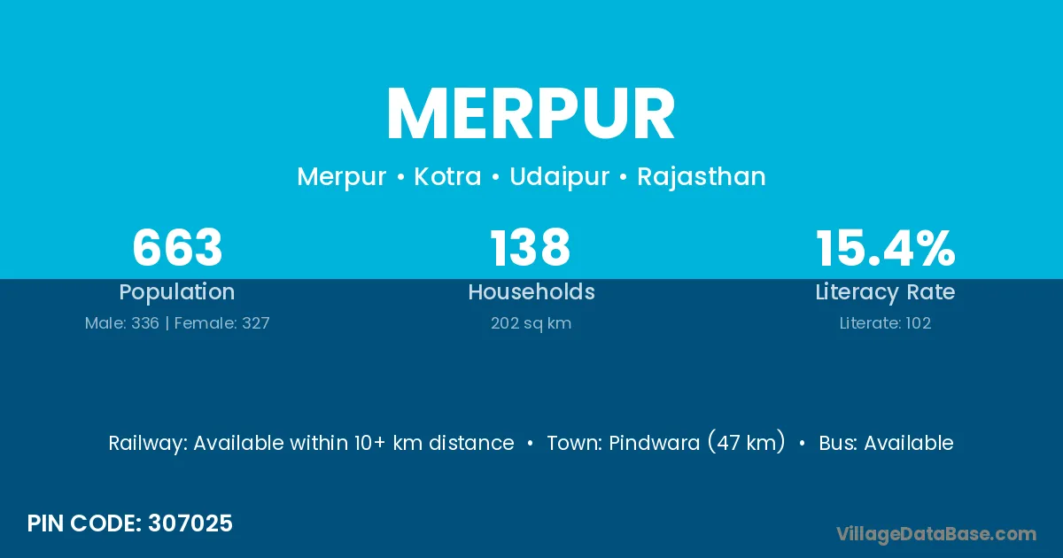 Pindwara (47 km) is the nearest town to Merpur village for major economic activities and is located approximately 47 km away.
