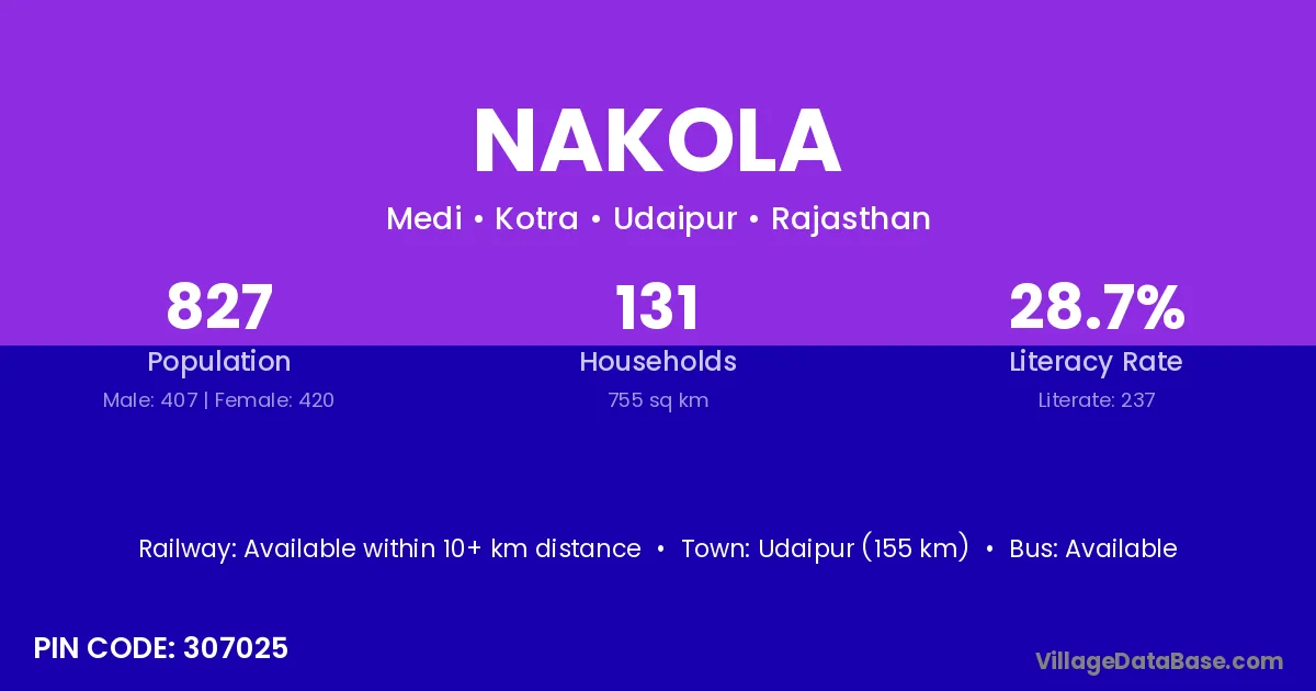 Udaipur (155 km) is the nearest town to Nakola village for major economic activities and is located approximately 155 km away.