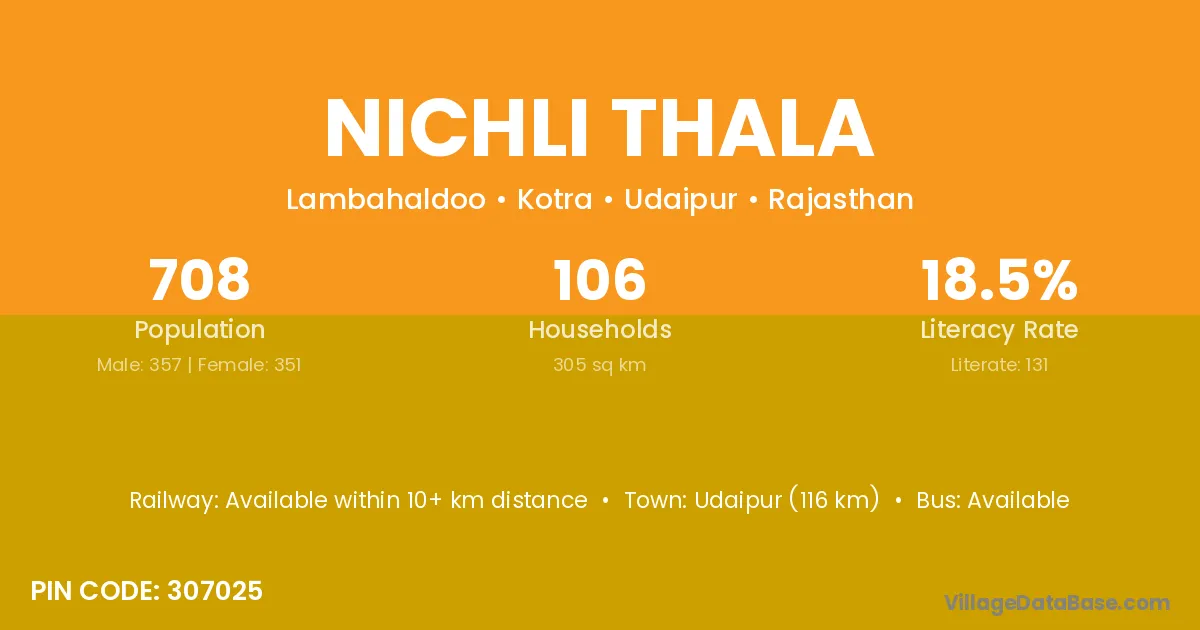 Udaipur (116 km) is the nearest town to Nichli Thala village for major economic activities and is located approximately 116 km away.