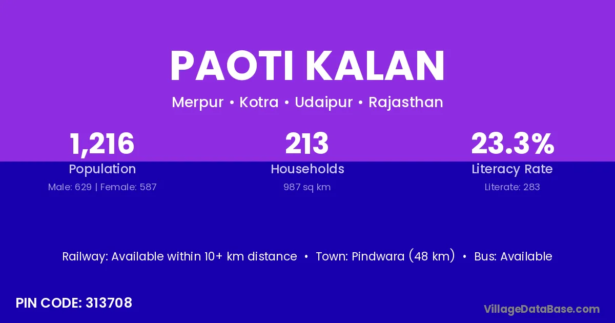 Pindwara (48 km) is the nearest town to Paoti Kalan village for major economic activities and is located approximately 48 km away.
