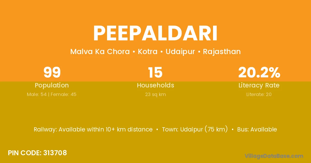 Udaipur (75 km) is the nearest town to Peepaldari village for major economic activities and is located approximately 75 km away.