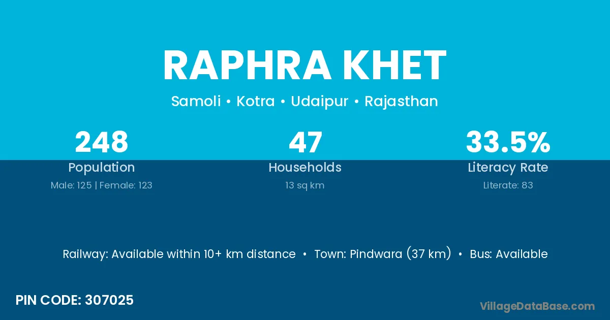 Pindwara (37 km) is the nearest town to Raphra Khet village for major economic activities and is located approximately 37 km away.