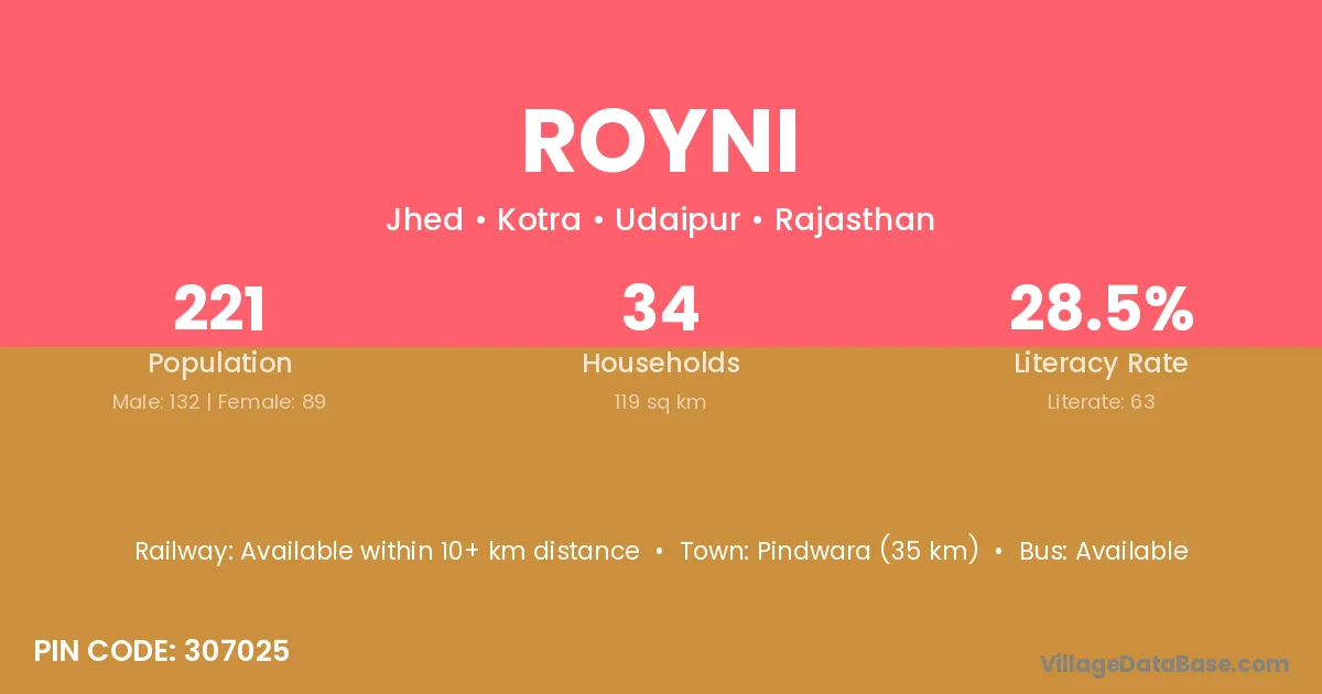 Pindwara (35 km) is the nearest town to Royni village for major economic activities and is located approximately 35 km away.