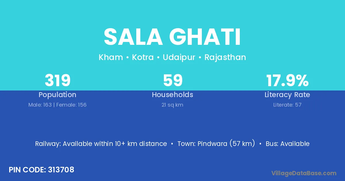 Pindwara (57 km) is the nearest town to Sala Ghati village for major economic activities and is located approximately 57 km away.
