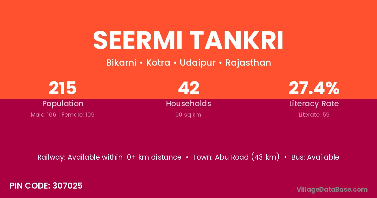 Abu Road (43 km) is the nearest town to Seermi Tankri village for major economic activities and is located approximately 43 km away.