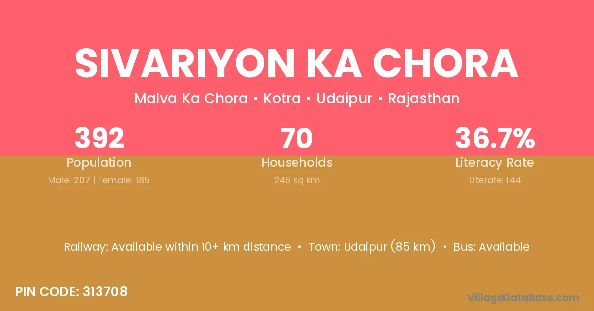 Udaipur (85 km) is the nearest town to Sivariyon Ka Chora village for major economic activities and is located approximately 85 km away.