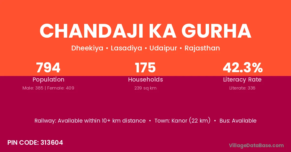Chandaji Ka Gurha village has a total population of 794 people, of which 385 are males and 409 are females.