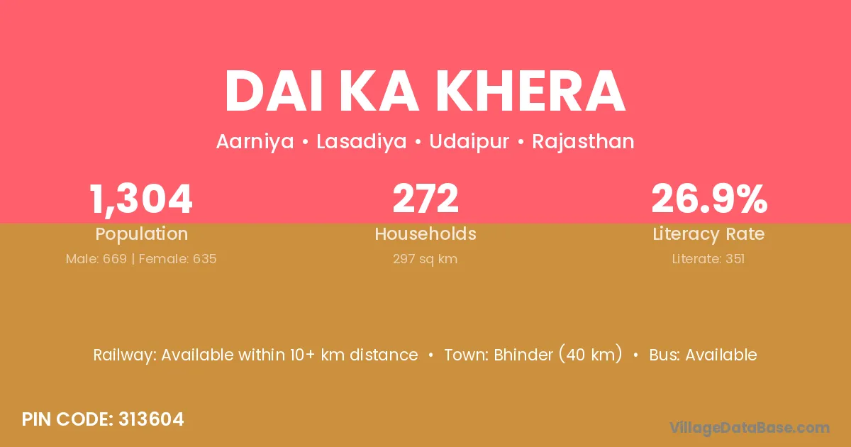 Dai Ka Khera village has a total population of 1,304 people, of which 669 are males and 635 are females.