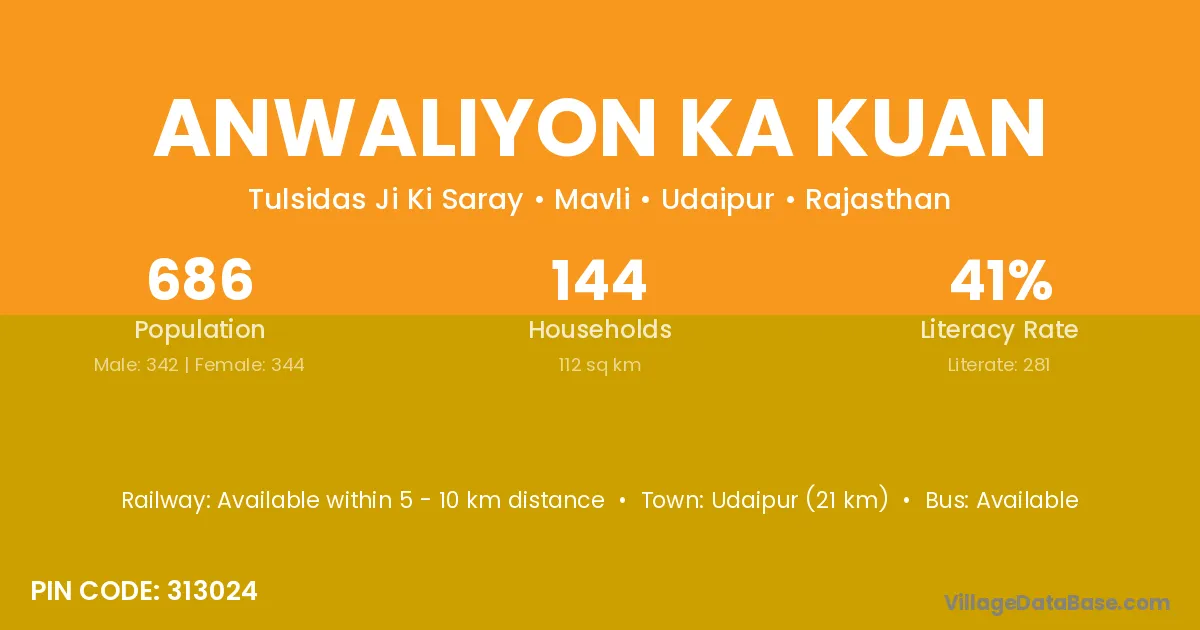 Udaipur (21 km) is the nearest town to Anwaliyon Ka Kuan village for major economic activities and is located approximately 21 km away.
