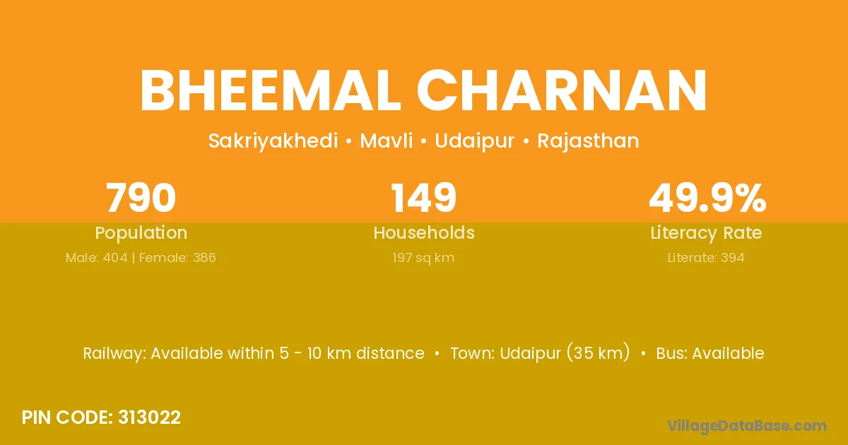 Udaipur (35 km) is the nearest town to Bheemal Charnan village for major economic activities and is located approximately 35 km away.