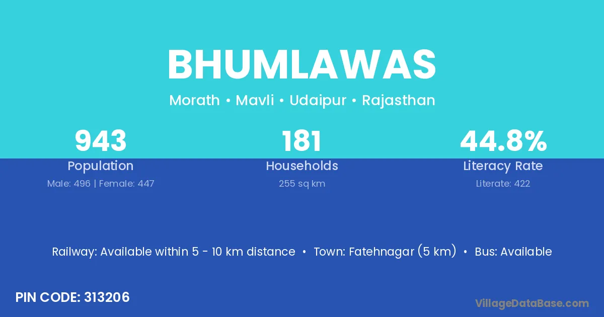 Bhumlawas village has a total population of 943 people, of which 496 are males and 447 are females.
