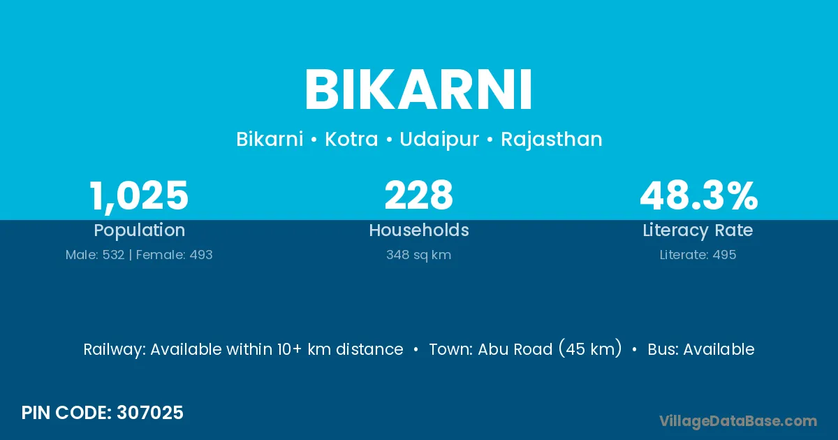 Udaipur (34 km) is the nearest town to Bikarni village for major economic activities and is located approximately 34 km away.