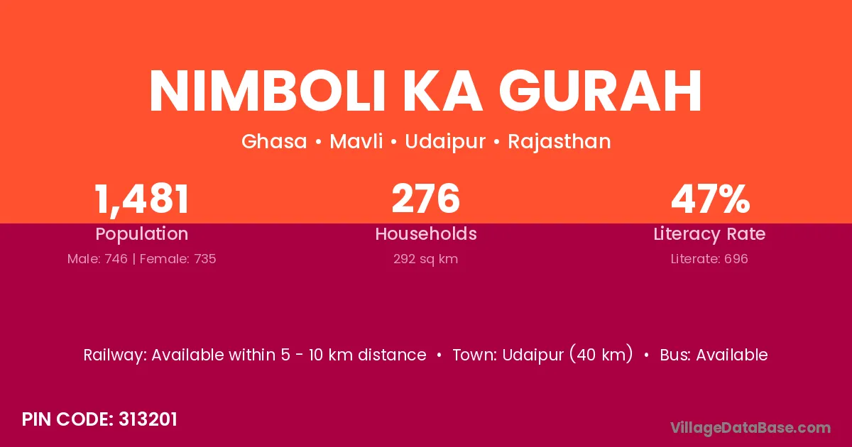 Udaipur (40 km) is the nearest town to Nimboli Ka Gurah village for major economic activities and is located approximately 40 km away.