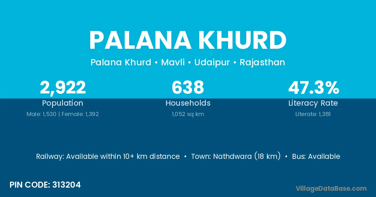 Nathdwara (18 km) is the nearest town to Palana Khurd village for major economic activities and is located approximately 18 km away.