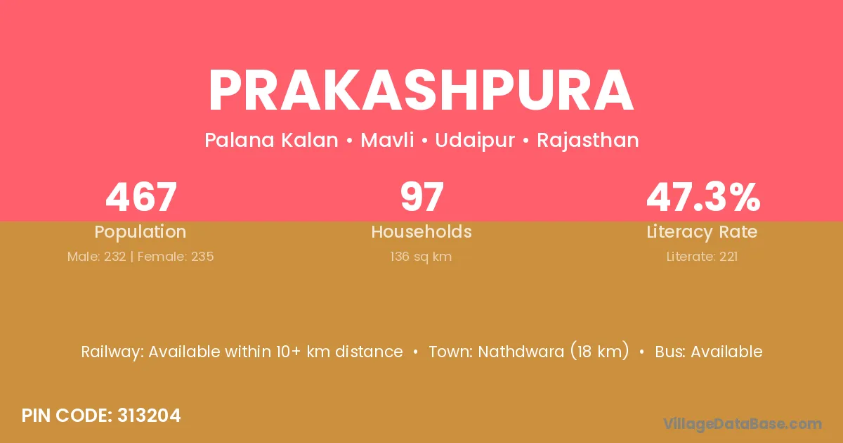 Prakashpura village has a total population of 467 people, of which 232 are males and 235 are females.