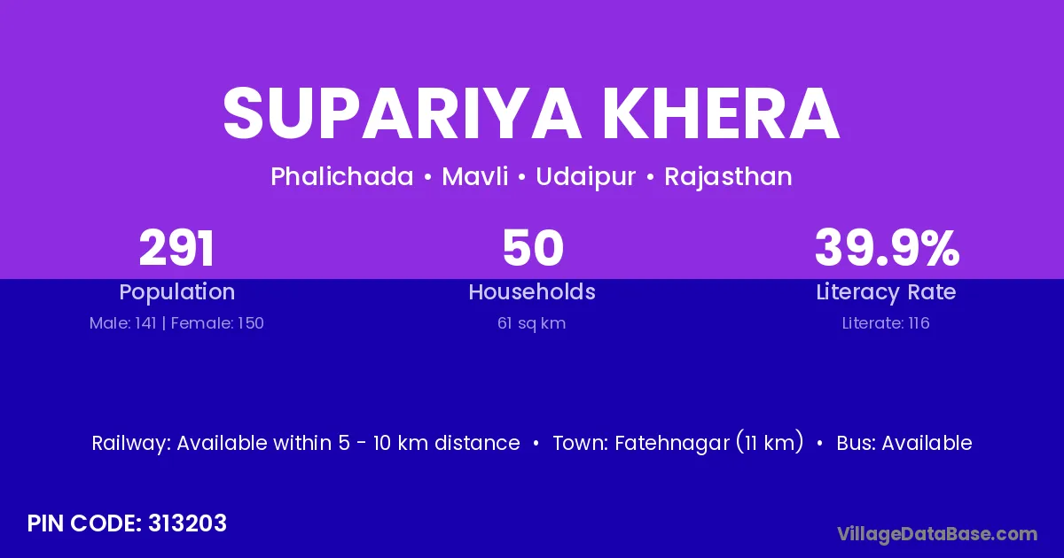Supariya Khera village has a total population of 291 people, of which 141 are males and 150 are females.