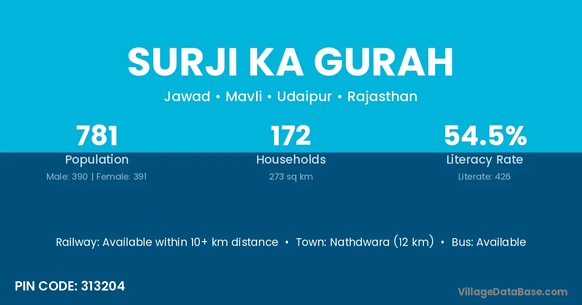 Nathdwara (12 km) is the nearest town to Surji Ka Gurah village for major economic activities and is located approximately 12 km away.