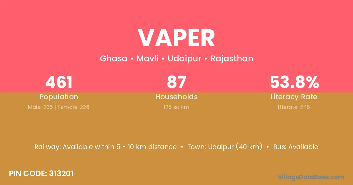 Udaipur (40 km) is the nearest town to Vaper village for major economic activities and is located approximately 40 km away.