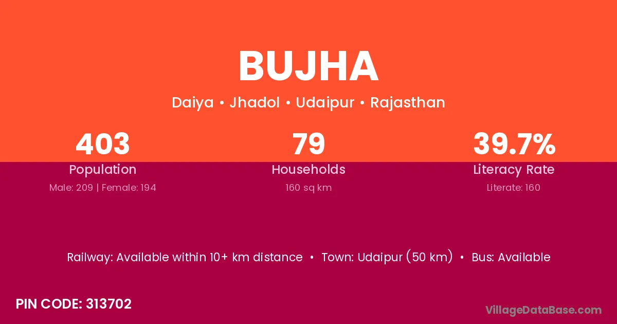 Dungarpur (44 km) is the nearest town to Bujha village for major economic activities and is located approximately 44 km away.