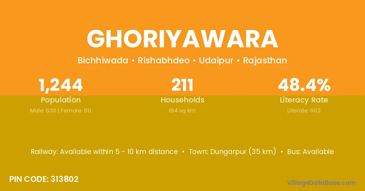 Dungarpur (35 km) is the nearest town to Ghoriyawara village for major economic activities and is located approximately 35 km away.