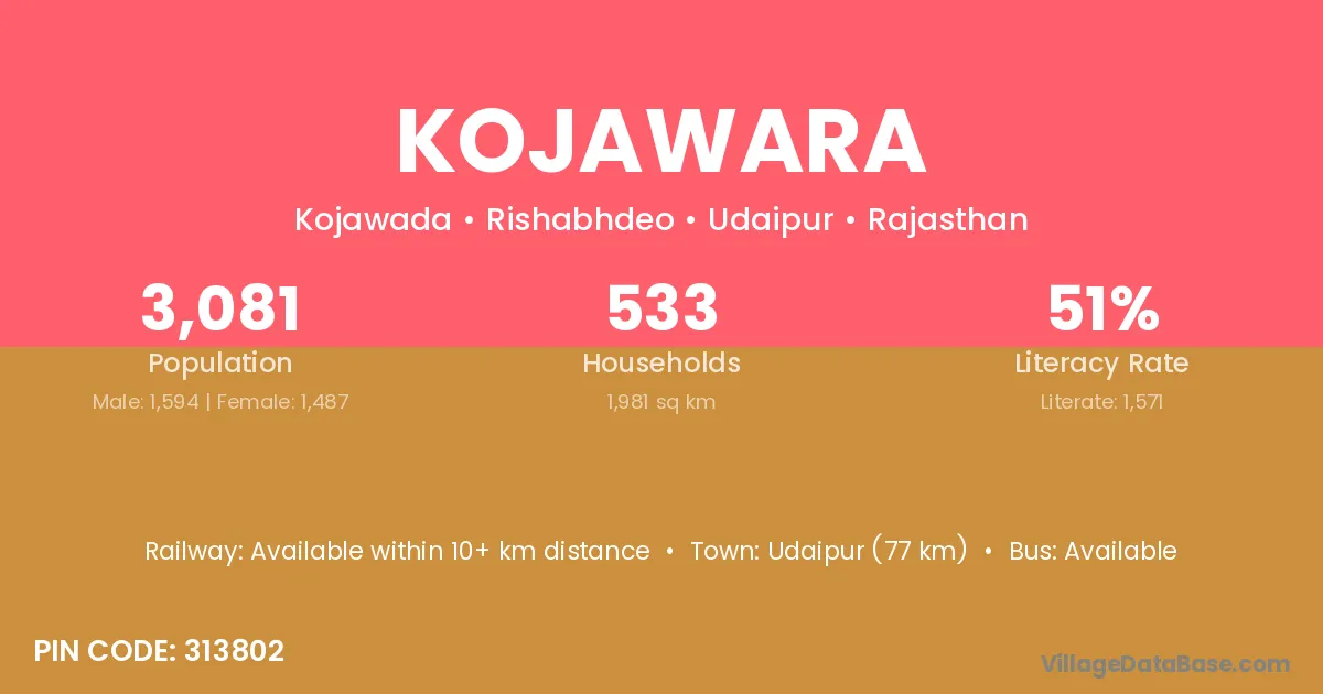 Udaipur (77 km) is the nearest town to Kojawara village for major economic activities and is located approximately 77 km away.
