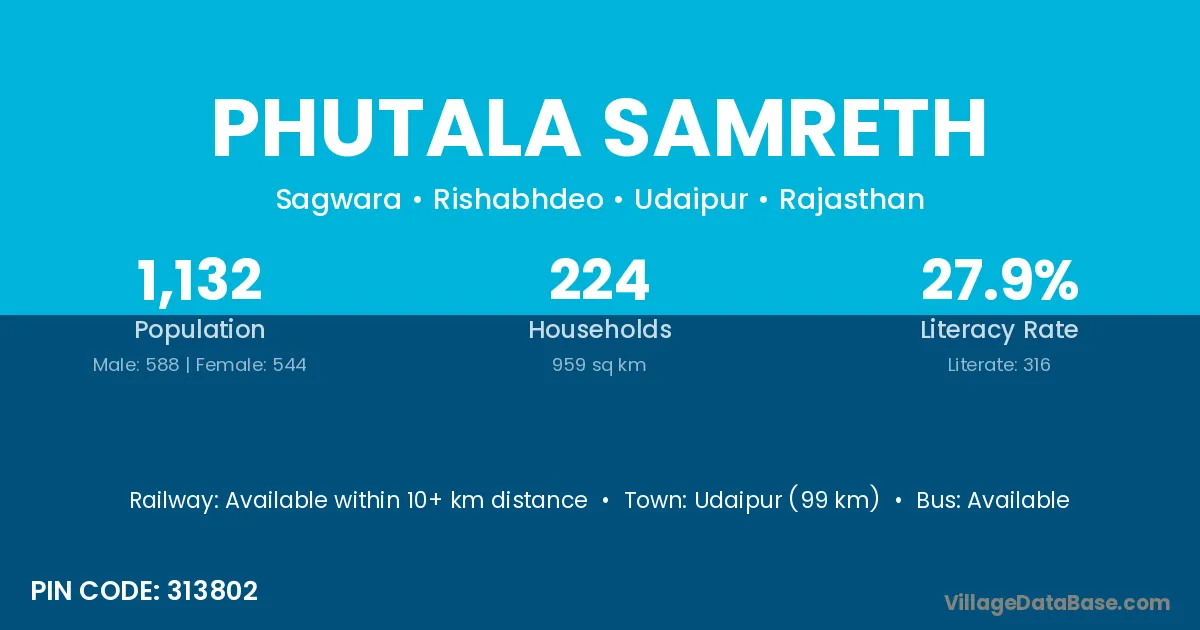 Udaipur (99 km) is the nearest town to Phutala Samreth village for major economic activities and is located approximately 99 km away.