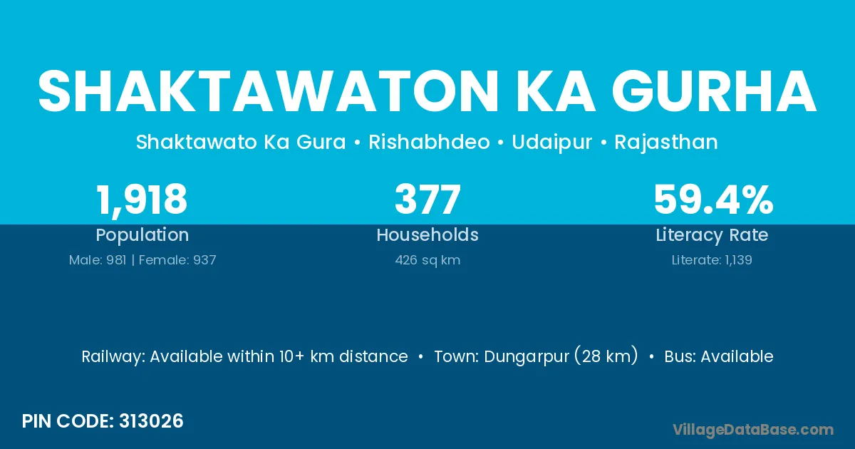 Dungarpur (28 km) is the nearest town to Shaktawaton Ka Gurha village for major economic activities and is located approximately 28 km away.