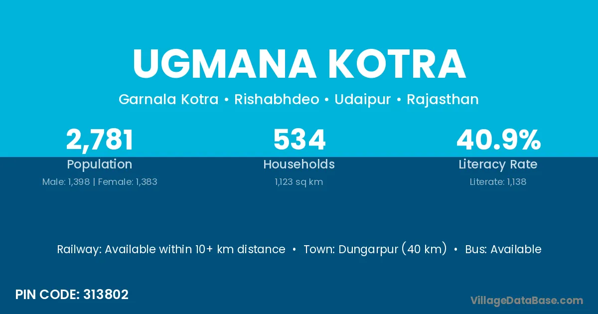 Dungarpur (40 km) is the nearest town to Ugmana Kotra village for major economic activities and is located approximately 40 km away.