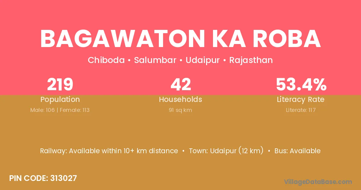 Udaipur (12 km) is the nearest town to Bagawaton Ka Roba village for major economic activities and is located approximately 12 km away.