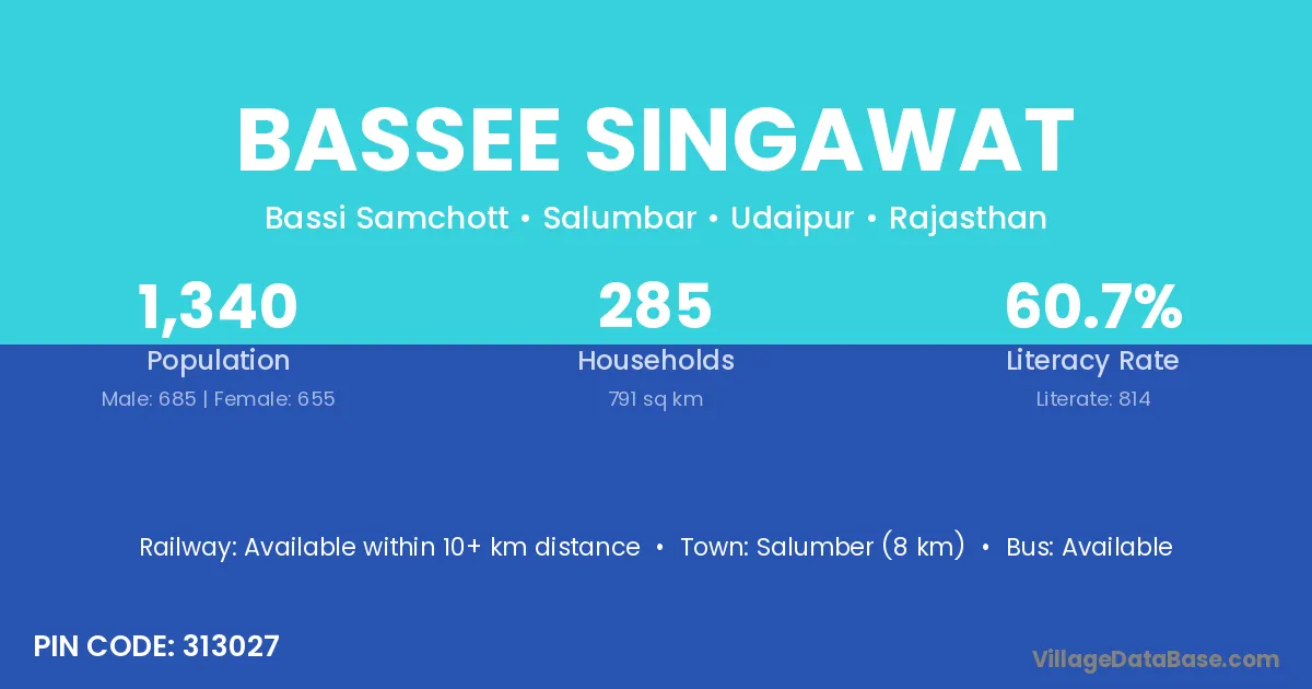 Salumber (8 km) is the nearest town to Bassee Singawat village for major economic activities and is located approximately 8 km away.