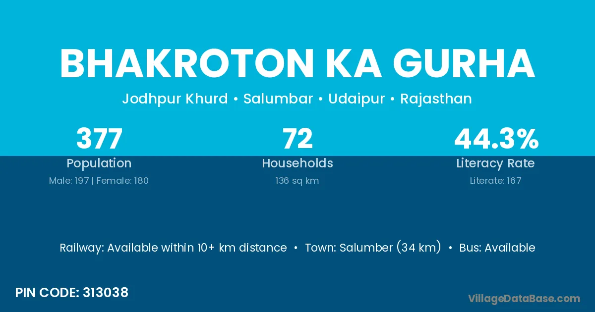 Bhakroton Ka Gurha village has a total population of 377 people, of which 197 are males and 180 are females.