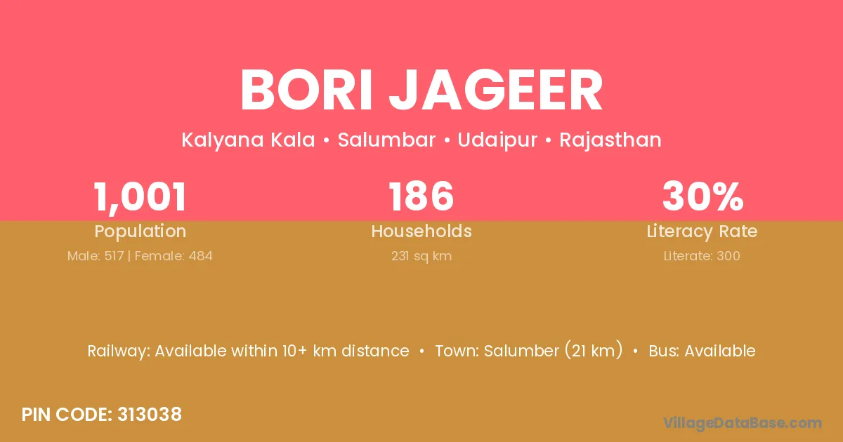 Salumber (21 km) is the nearest town to Bori Jageer village for major economic activities and is located approximately 21 km away.