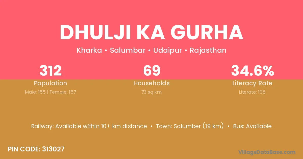 Dhulji Ka Gurha village has a total population of 312 people, of which 155 are males and 157 are females.