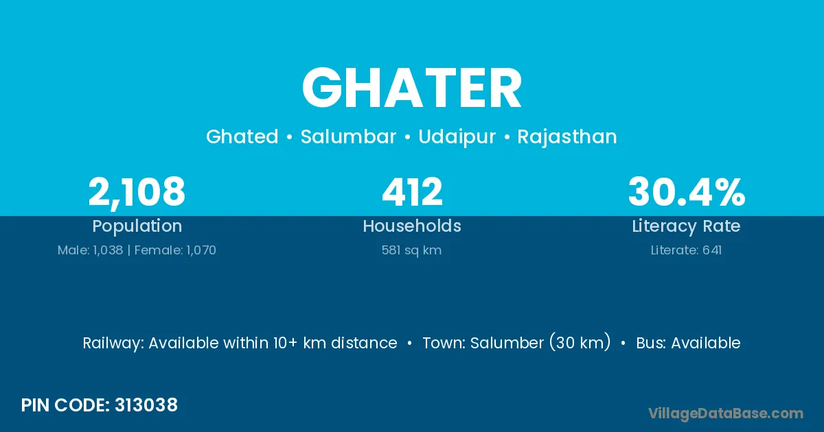 Salumber (30 km) is the nearest town to Ghater village for major economic activities and is located approximately 30 km away.