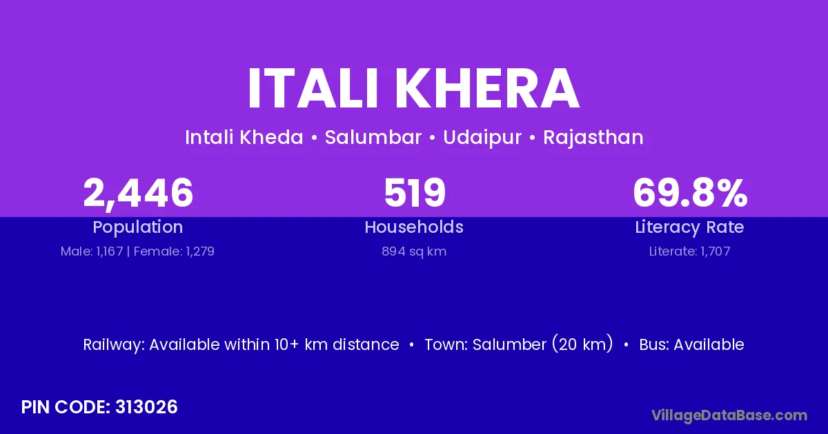 Salumber (20 km) is the nearest town to Itali Khera village for major economic activities and is located approximately 20 km away.