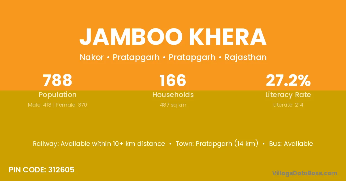 Salumber (35 km) is the nearest town to Jamboo Khera village for major economic activities and is located approximately 35 km away.