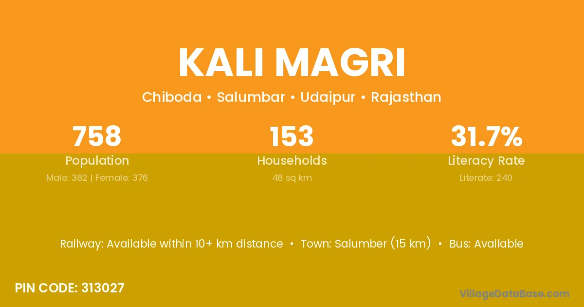 Salumber (15 km) is the nearest town to Kali Magri village for major economic activities and is located approximately 15 km away.