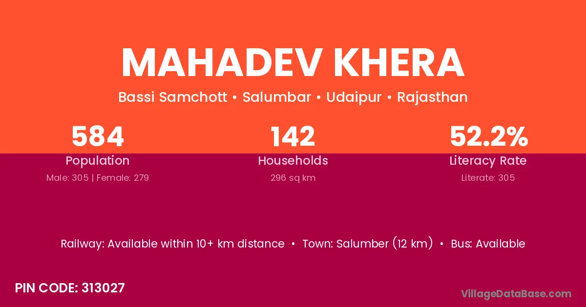Salumber (12 km) is the nearest town to Mahadev Khera village for major economic activities and is located approximately 12 km away.