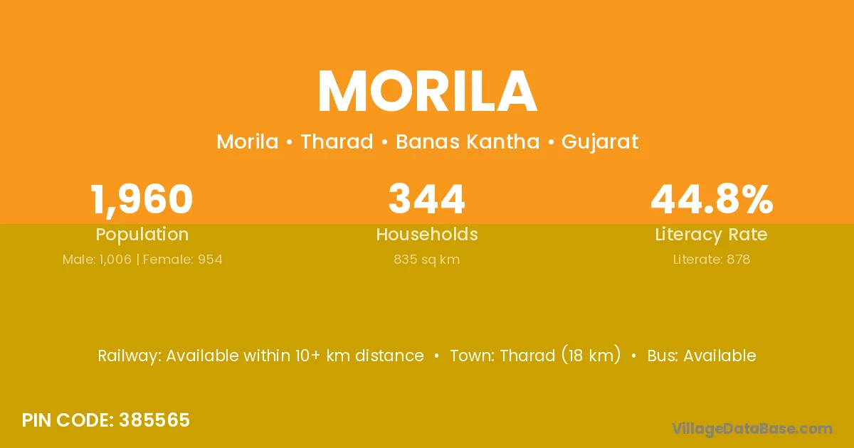 The literacy rate of Morila village is 31.60%. Male literacy stands at 46.49% and female literacy at 16.47%.