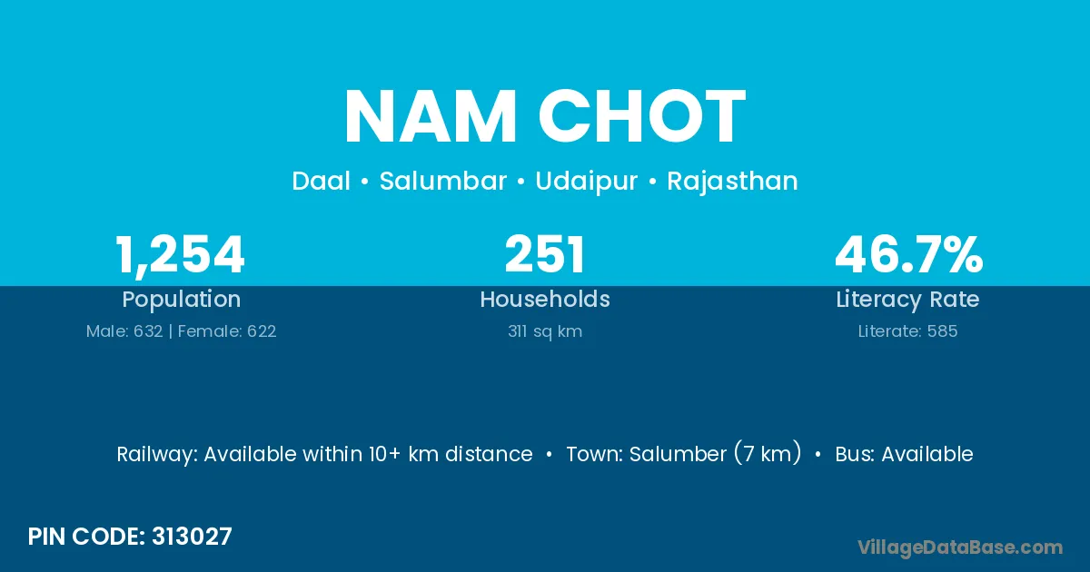 Salumber (7 km) is the nearest town to Nam Chot village for major economic activities and is located approximately 7 km away.