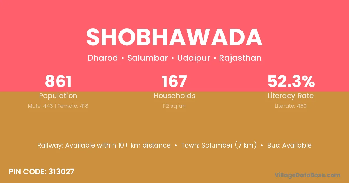 Salumber (7 km) is the nearest town to Shobhawada village for major economic activities and is located approximately 7 km away.