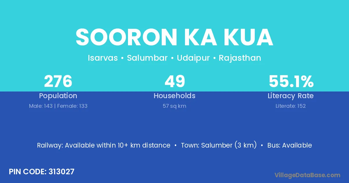 Salumber (3 km) is the nearest town to Sooron Ka Kua village for major economic activities and is located approximately 3 km away.