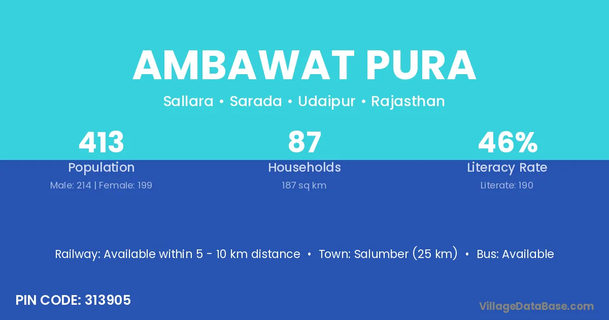 Salumber (25 km) is the nearest town to Ambawat Pura village for major economic activities and is located approximately 25 km away.