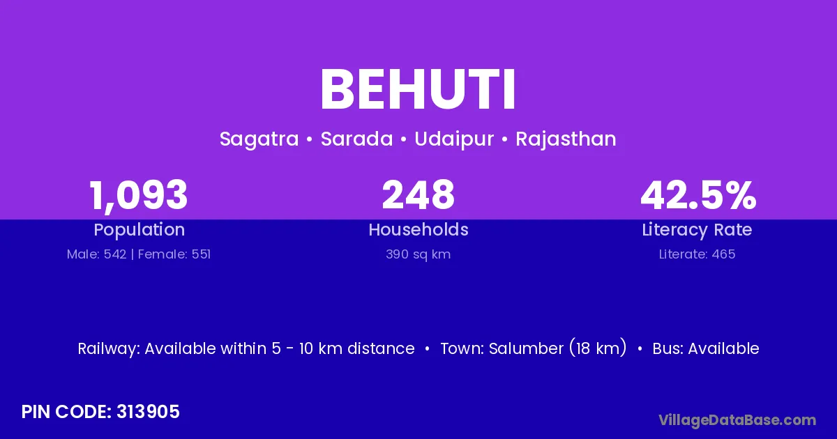 Salumber (18 km) is the nearest town to Behuti village for major economic activities and is located approximately 18 km away.