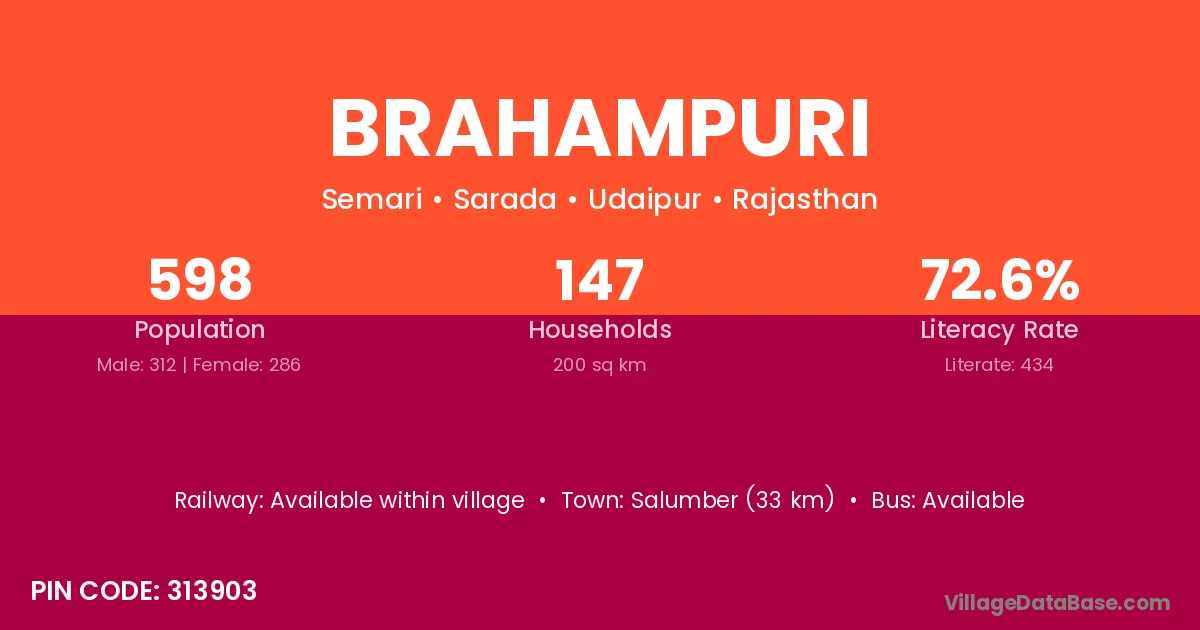 Salumber (33 km) is the nearest town to Brahampuri village for major economic activities and is located approximately 33 km away.
