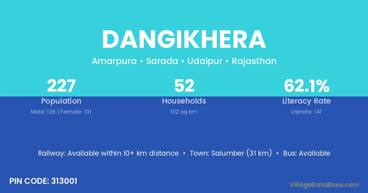 Salumber (31 km) is the nearest town to Dangikhera village for major economic activities and is located approximately 31 km away.