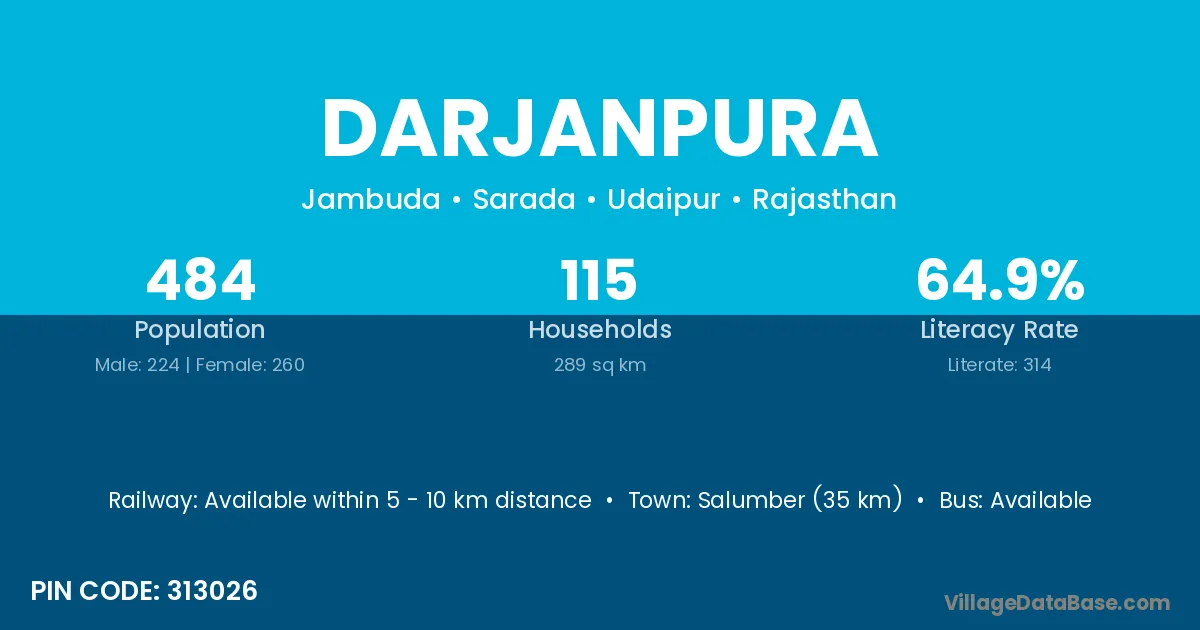 Salumber (35 km) is the nearest town to Darjanpura village for major economic activities and is located approximately 35 km away.