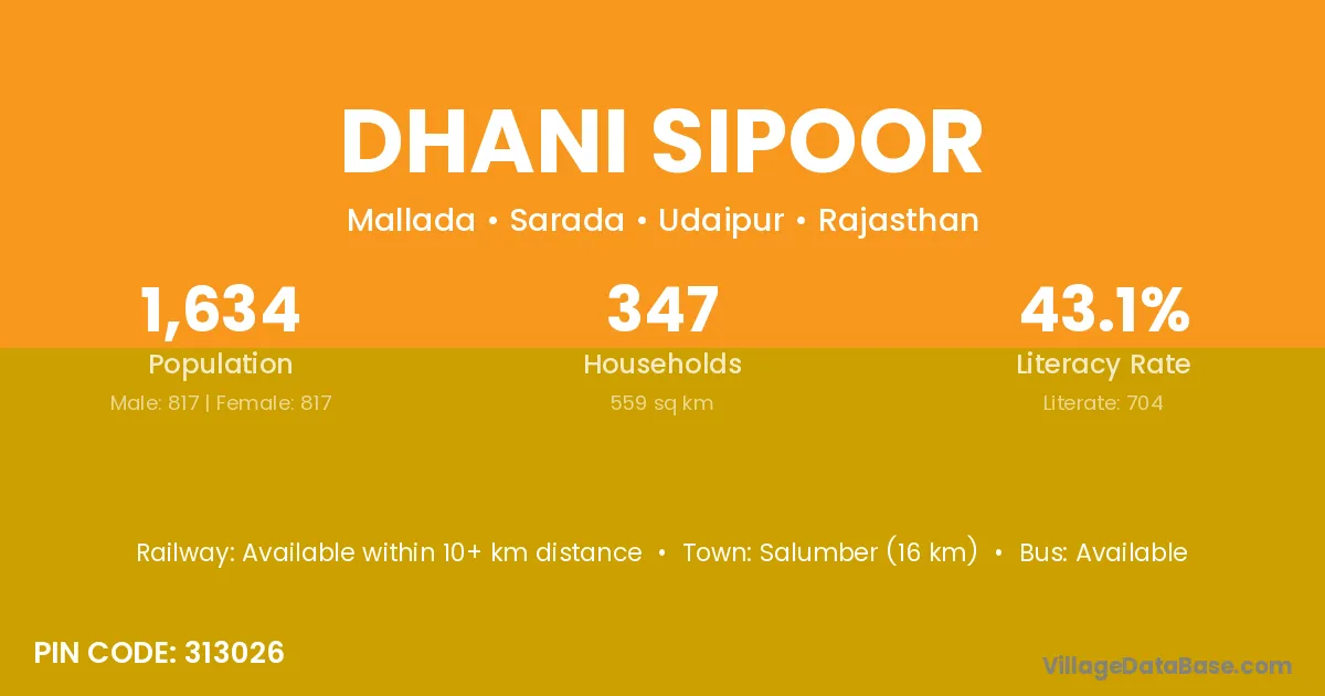 Salumber (16 km) is the nearest town to Dhani Sipoor village for major economic activities and is located approximately 16 km away.