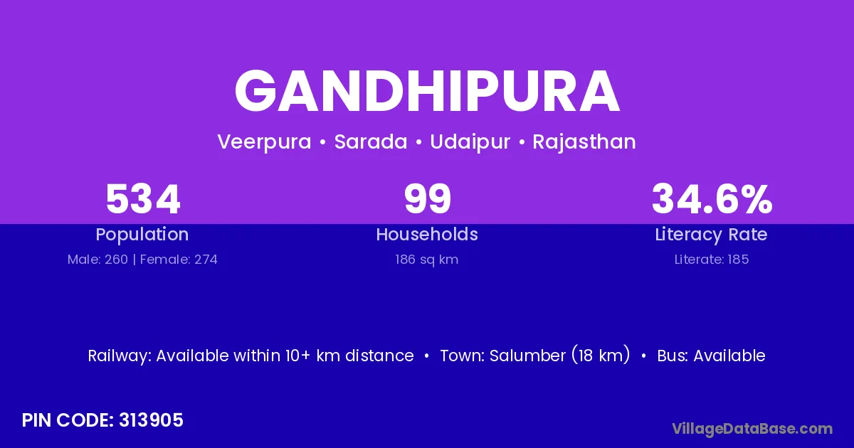 Salumber (18 km) is the nearest town to Gandhipura village for major economic activities and is located approximately 18 km away.