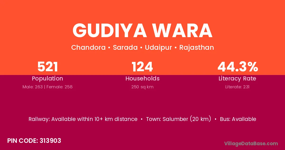 Salumber (20 km) is the nearest town to Gudiya Wara village for major economic activities and is located approximately 20 km away.